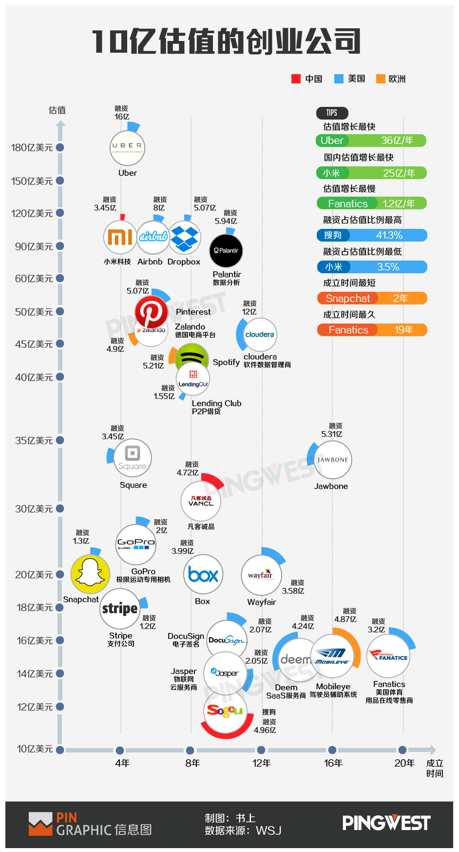 2014年6月,Uber再次融資12億美元,總體估值高達182億美元。而除了Uber外,在中國、歐洲以及美國的新創企業中,共有24家科技公司躋身10億美元俱樂部。它們誰的估值增長最快?誰的成立時間最短?看看PingWest製作的資訊圖表。     出自Pingwest     【延伸閱讀】7/9 創業小聚暨AAMA臺北搖籃計畫年會