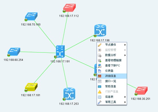 Mocha BSM軟件在拓撲圖中撐持直接鼠標右鍵點擊設(shè)備圖標,就能夠彈出菜單,進行其他功用的操作,包含對節(jié)點操作、監(jiān)控辦理、數(shù)據(jù)剖析、檢查物理連接、檢查下聯(lián)PC、儀表盤、具體信息、接口一覽、背板信息、IT財物辦理、信息表、常用工具。如下圖