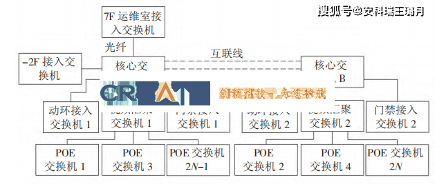 動環監控系統由2臺服務器(雙機熱備)、2臺客戶端PC機、監控大屏、核心交換機(A、B網)、視頻匯聚交換機、門禁接入交換機、采集箱及串口服務器等構成。
